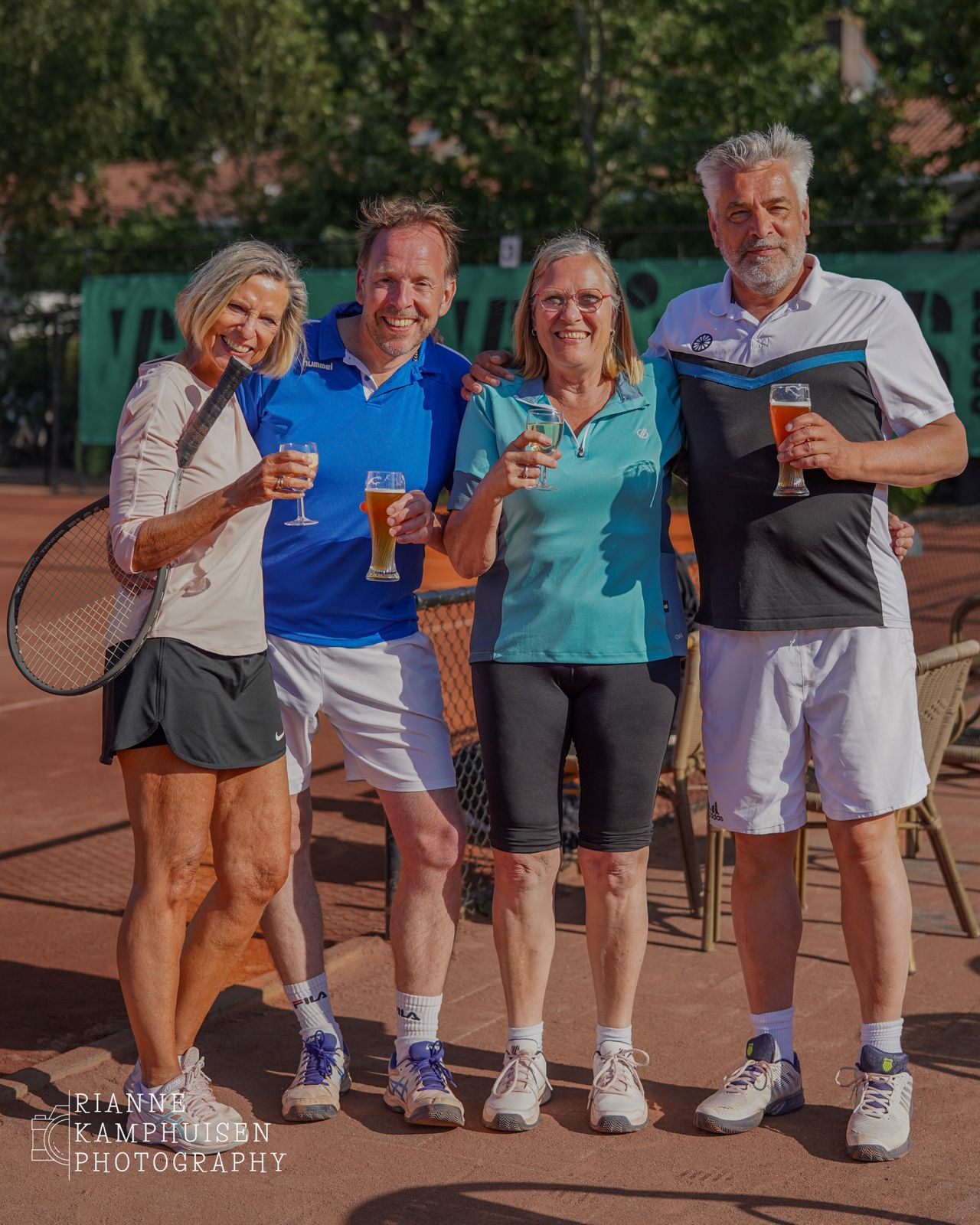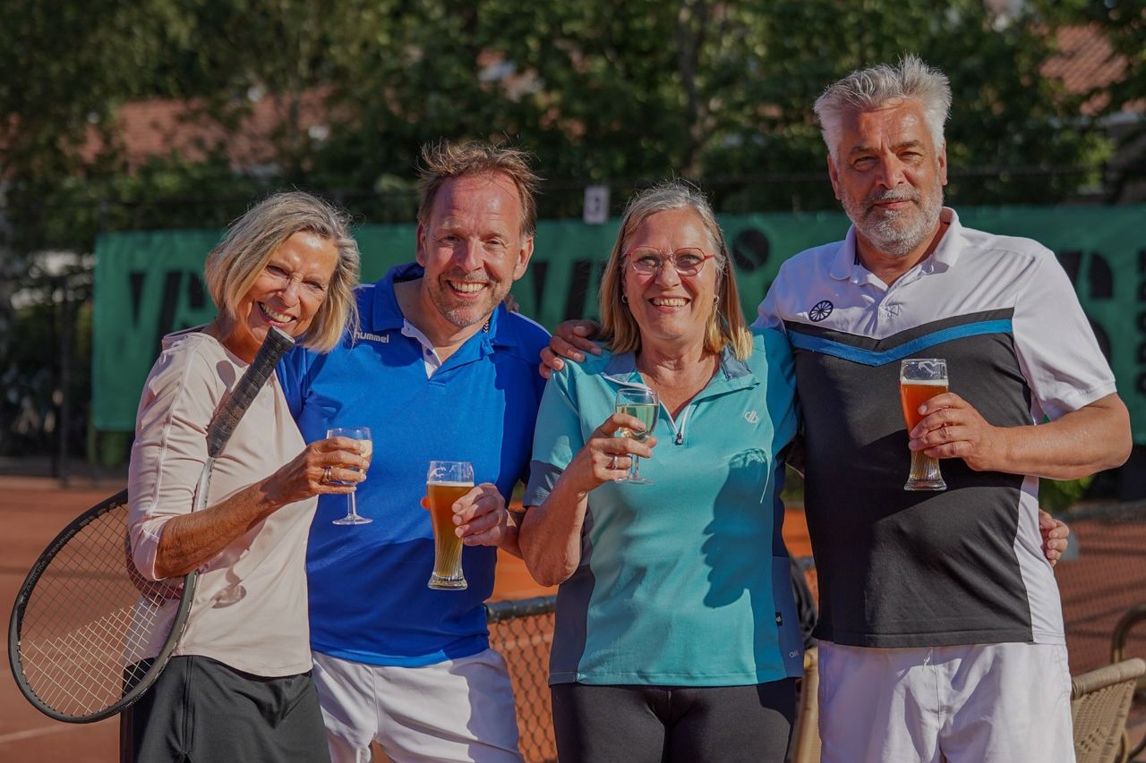 De samenstelling wisselde door de jaren heen, maar sfeer en humor bleven altijd vaste basis. Jos en Theo zijn er vanaf dag 1 bij, later kwamen Matthieu, Harrie en Ineke. Jos mist dit voorjaar door zijn reislust 🌍, maar volgt vanuit Afrika de verhalen in de groepsapp. Na elke speeldag volgt een uitgebreid wedstrijdverslag én aftertennis-verhaal. Want bij dit team is de derde helft heilig. En als de tegenstanders weg zijn? Dan start het after-after-tennis met een laatste drankje en veel gelach 🍷en een evaluatie van de dag.🎾